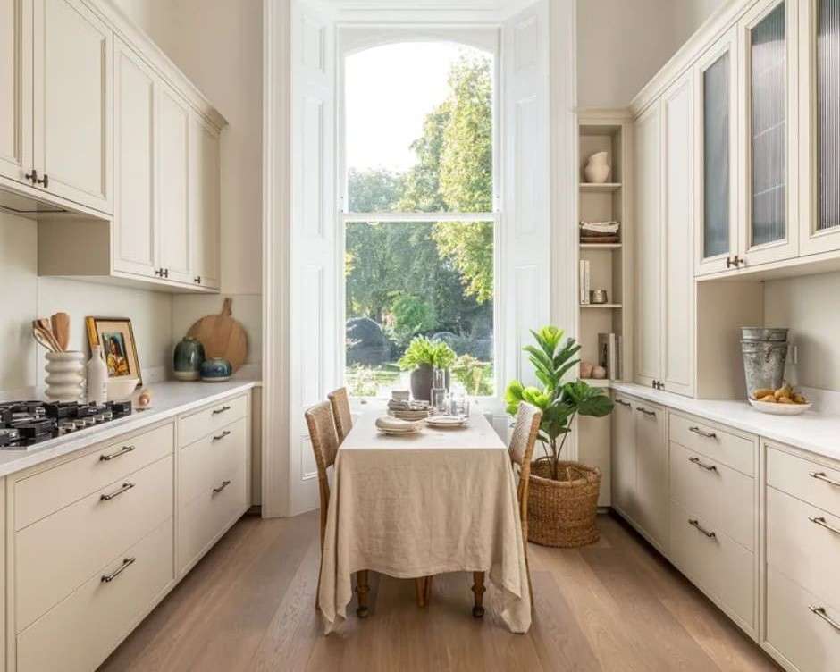 В классической бежевой кухне уместны декоративные элементы, такие как лепнина, карнизы, пилястры и витражи. Освещение должно быть мягким и рассеянным, создающим уютную атмосферу.