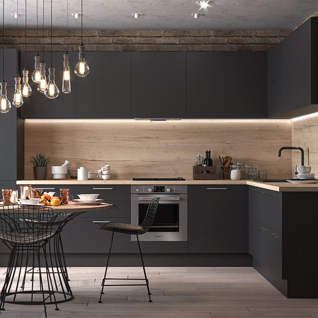 Стиль лофт характеризуется индустриальным дизайном, использованием грубых материалов и открытых коммуникаций. Для угловой кухни в стиле лофт характерны: