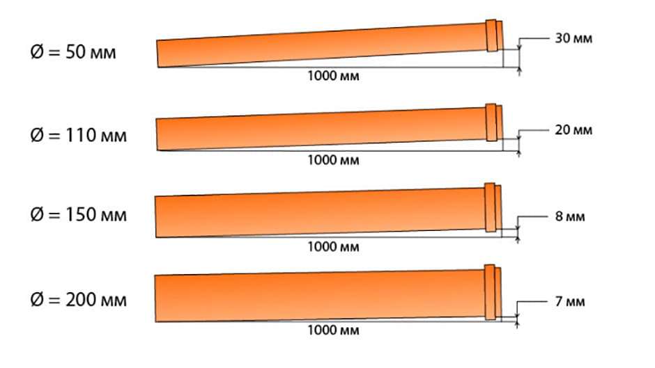 - Для труб диаметром 100-110 мм: минимальный уклон составляет 0,02 (2 см на 1 метр трубы).
